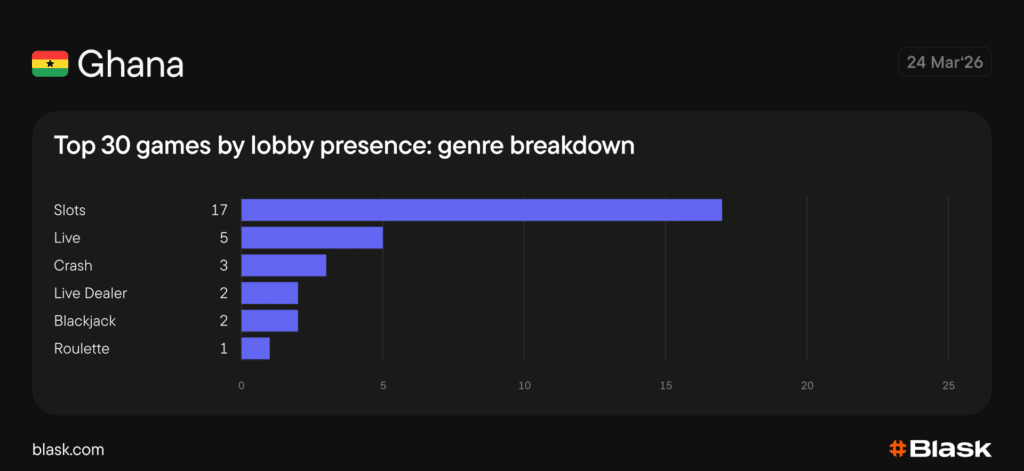 • Ghana’s market shows a more diverse genre mix than many others in the study, combining slots, live games, crash titles, and table content.
