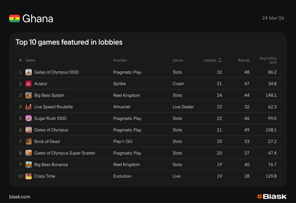 Lobby rankings in Ghana are led by slot-heavy visibility, with Gates of Olympus 1000 taking the top position, followed by Aviator and Big Bass Splash. Pragmatic Play dominates the top 10 through multiple entries, while titles such as Live Speed Roulette and Crazy Time add representation from live gaming.
