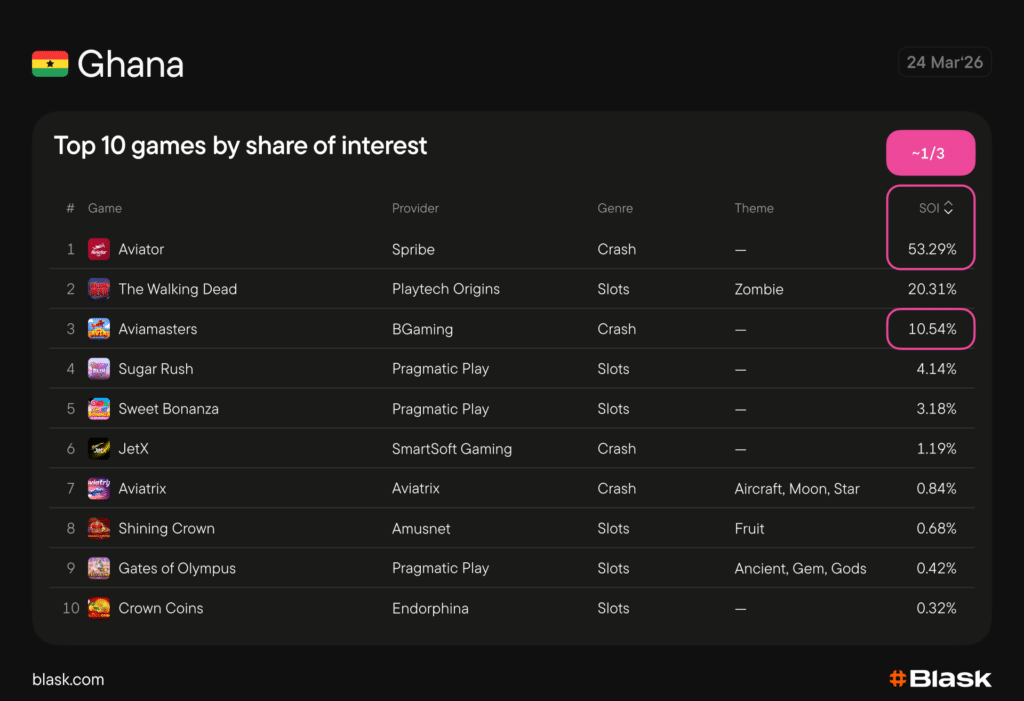 Player demand in Ghana is led by crash games, with Aviator in the lead and Aviamasters ranking third. Slots remain present through titles such as Sugar Rush, Sweet Bonanza, and Gates of Olympus, while The Walking Dead stands out as a high-interest title absent from the lobby top 10.