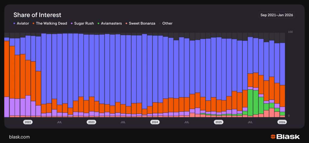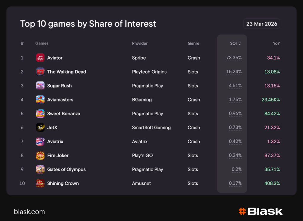 Notably, several crash titles appear in the top ten, including Aviamasters, JetX, and Aviatrix but their individual shares remain relatively small. This indicates that while the crash category is expanding, Aviator retains near-monopoly status within it.