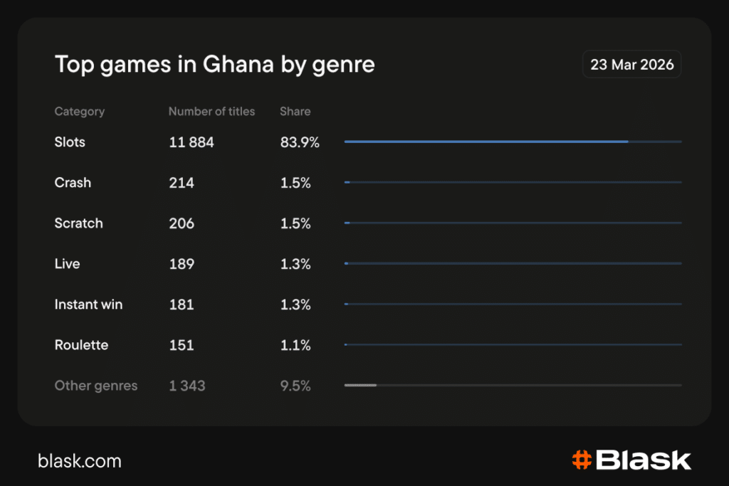 Ghana’s catalog composition closely mirrors global patterns, with slightly more room for non-slot formats. Slots account for 83.9% of all titles, making them the clear backbone of operator inventories.