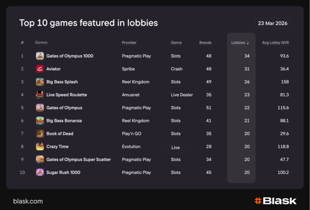 - GVR (Game visibility rank) — daily ranking of game placement across operator lobbies. Blask scans lobbies daily, recognizes tens of thousands of games, and shows: how many brands carry each game, how often it appears in lobbies and other pages and at what average position.