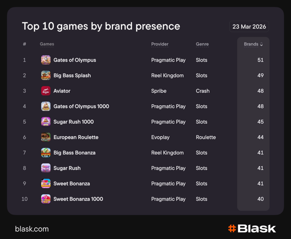 The Pragmatic Play footprint extends further through Reel Kingdom, its subsidiary label, Big Bass Splash and Big Bass Bonanza both land in the top ten. Outside this ecosystem, only two non-slot titles break through: Aviator from Spribe, appearing across 49 brands, and European Roulette from Evoplay with 44 brands.