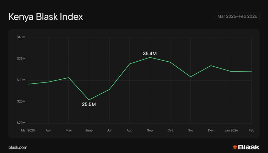 Oct–Feb: AFCON lift and stabilization. A brief dip around November, driven by the October international break pausing Premier League fixtures, gave way to renewed momentum. AFCON 2025 launched on December 21 in Morocco, and despite Kenya’s Harambee Stars failing to qualify, the tournament sustained betting interest through January. Blask Index settled into early 2026, maintaining levels above the prior year’s starting point.