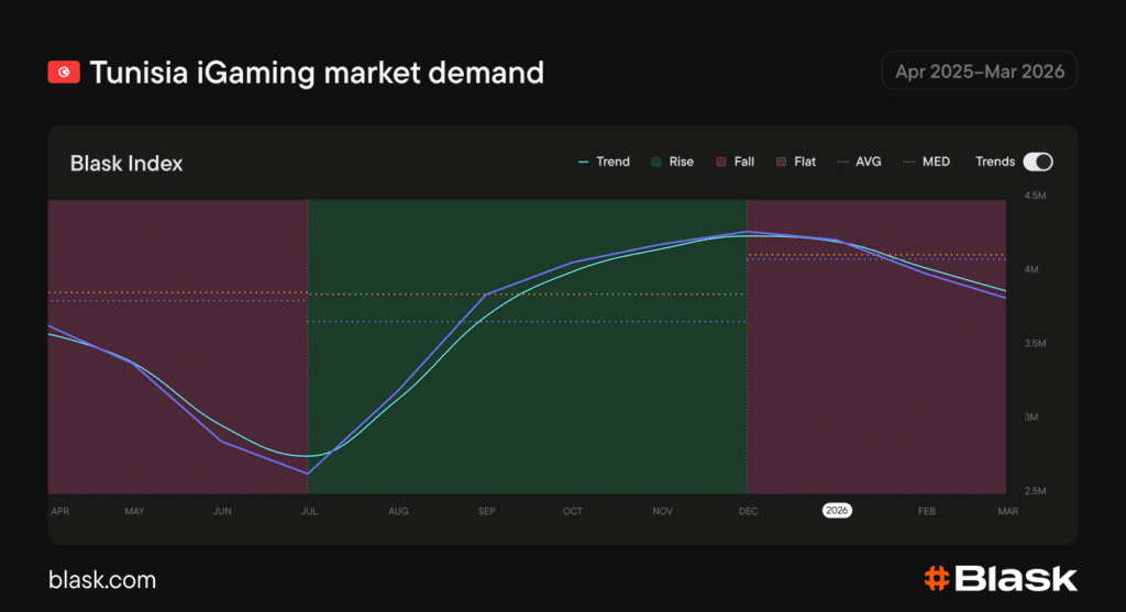 Tunisia’s World Cup qualification, sealed in September 2025 with a dramatic late winner over Equatorial Guinea, added a strong layer of national engagement through the autumn months. AFCON 2025 in Morocco drove the December peak, with Tunisia participating in the tournament before being eliminated by Mali in the round of sixteen.