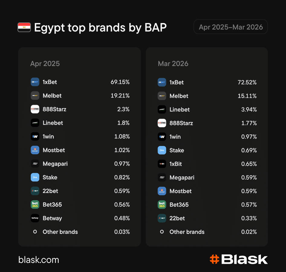 1xBet entered the period already holding the dominant share of market demand and expanded it further by March 2026. Melbet, the only operator with real scale behind the leader, gave up ground over the year. Linebet was the one exception, growing steadily from a small base. No other operator moved the needle. The market is effectively a one-brand story, with the rest of the field competing for what remains.