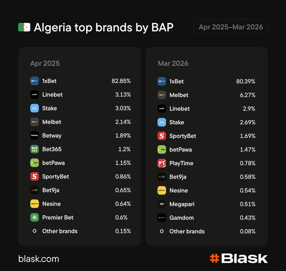 1xBet’s position in Algeria is in a different category from any other market in this dataset. The operator held an overwhelming share of market demand in April 2025 and closed the period barely changed — the market simply did not generate meaningful competitive pressure.