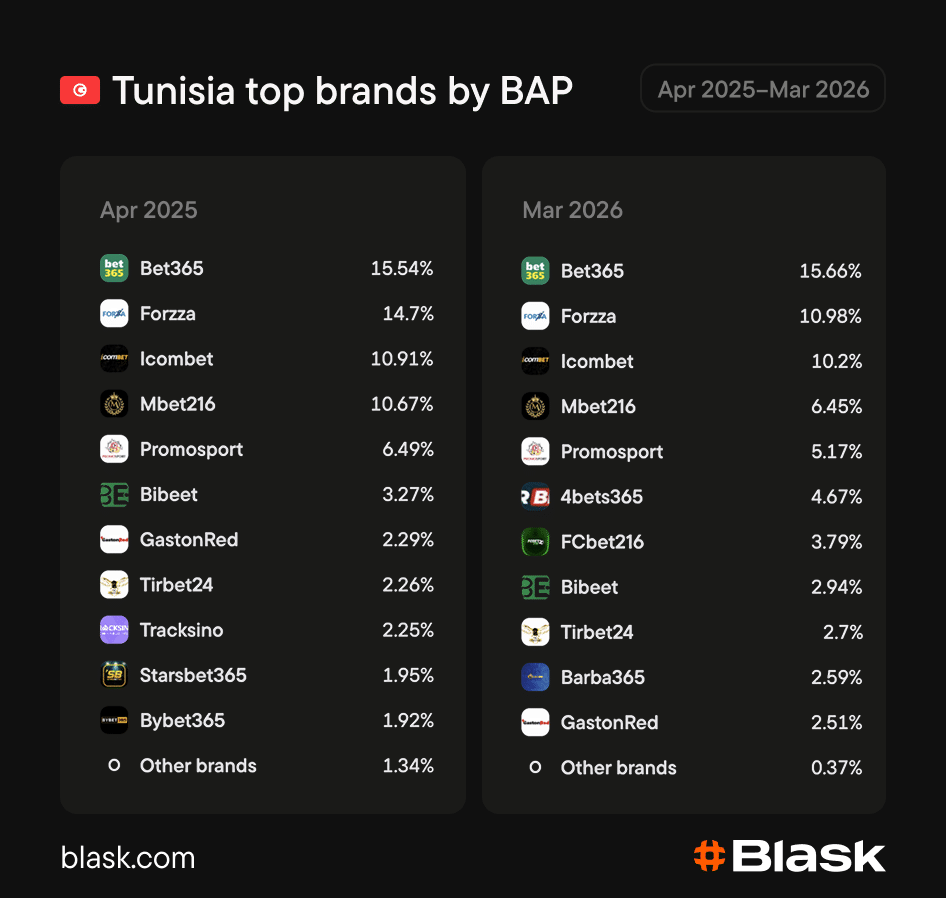 The brand landscape is where Tunisia separates itself completely from the other two. No operator comes close to dominance — the top of the market is genuinely clustered, with Bet365 holding a narrow lead and Forzza, Icombet, and Mbet216 sitting close behind.